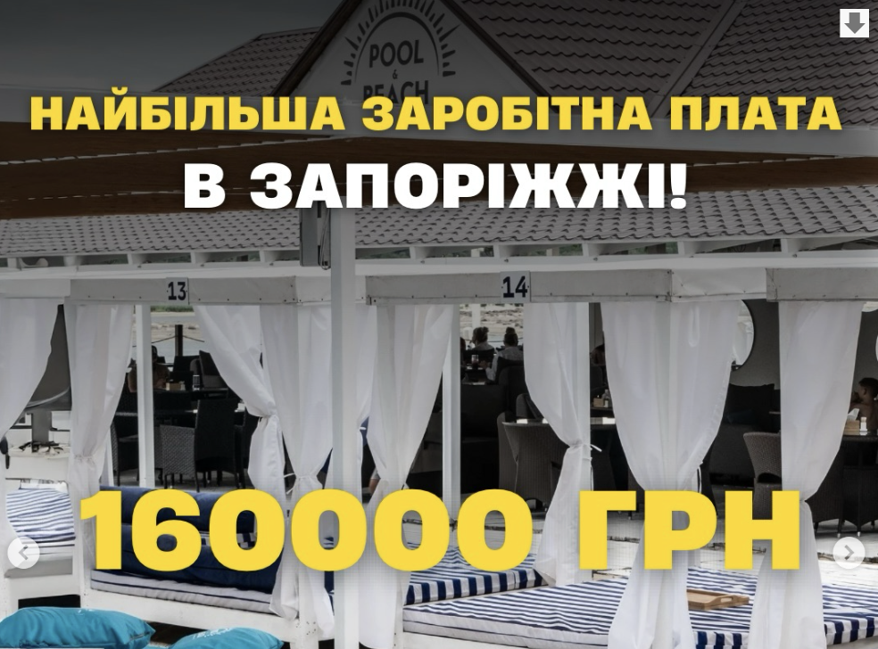 У Запоріжжі пляжний комплекс Pool and Beach опублікував вакансію директора та заявив про одну з найвищих зарплат у місті — до 160 тисяч гривень. Оголошення з’явилося на сторінці закладу в Instagram і вже викликало активну реакцію користувачів.