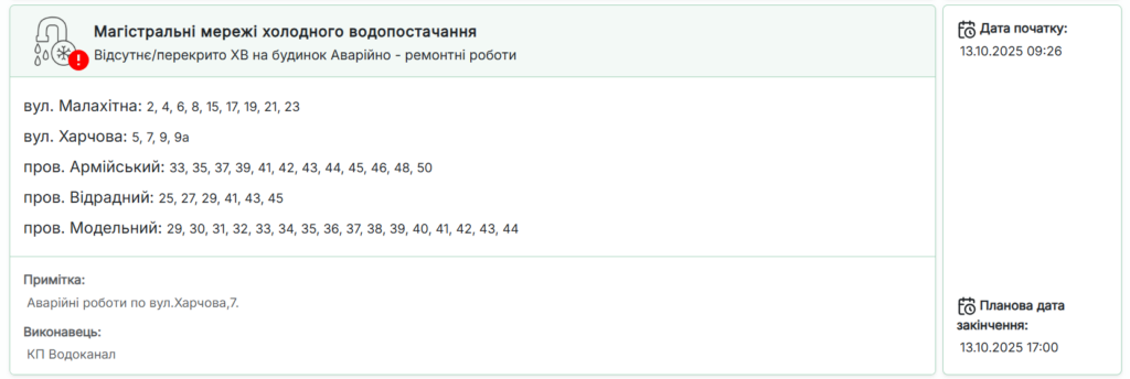 КП «Водоканал» повідомляє про проведення аварійно-ремонтних робіт на магістральних мережах холодного водопостачання по вул. Харчова, 7.