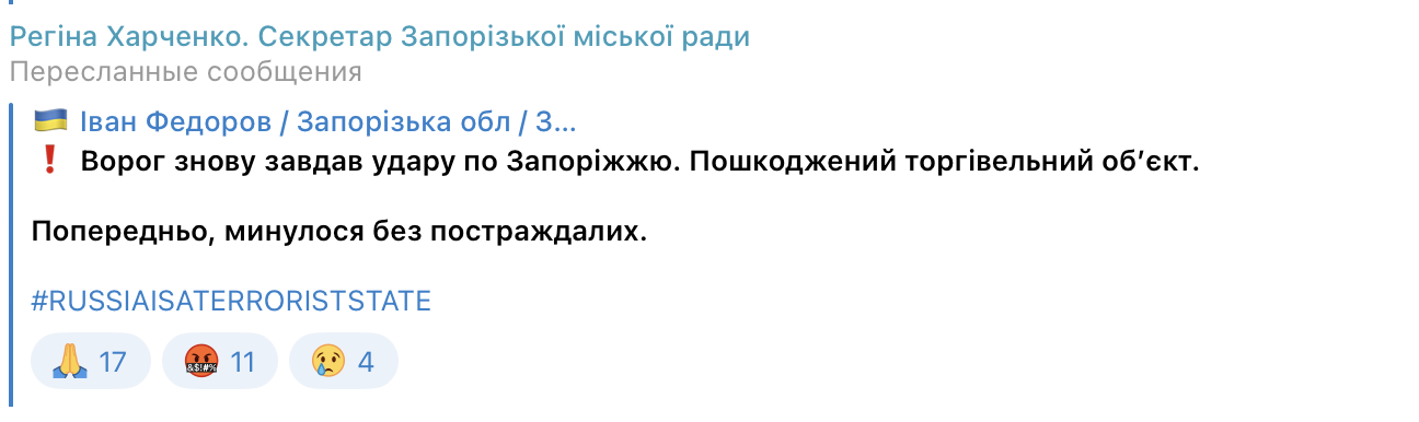 Ворог знову завдав удару по Запоріжжю. Пошкоджений торгівельний обʼєкт.