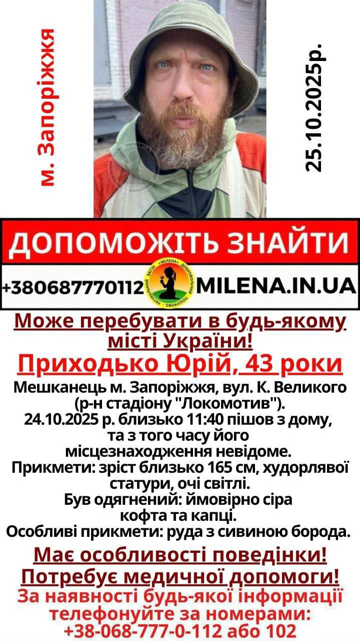У Запоріжжі розшукують 43-річного Приходька Юрія, який 24 жовтня 2025 року близько 11:40 вийшов із дому по вулиці К. Великого (район стадіону «Локомотив») і з того часу не повернувся. Місцеперебування чоловіка досі невідоме.
