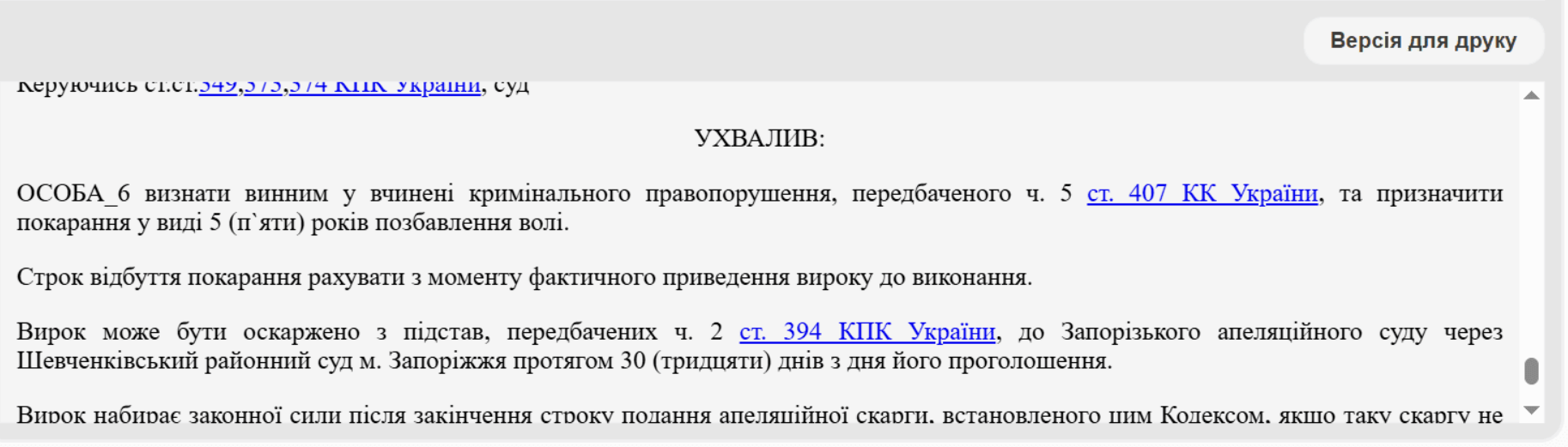 Суд визнав чоловіка винним за ч. 5 ст. 407 КК України (самовільне залишення військової частини в умовах воєнного стану) та призначив 5 років позбавлення волі.