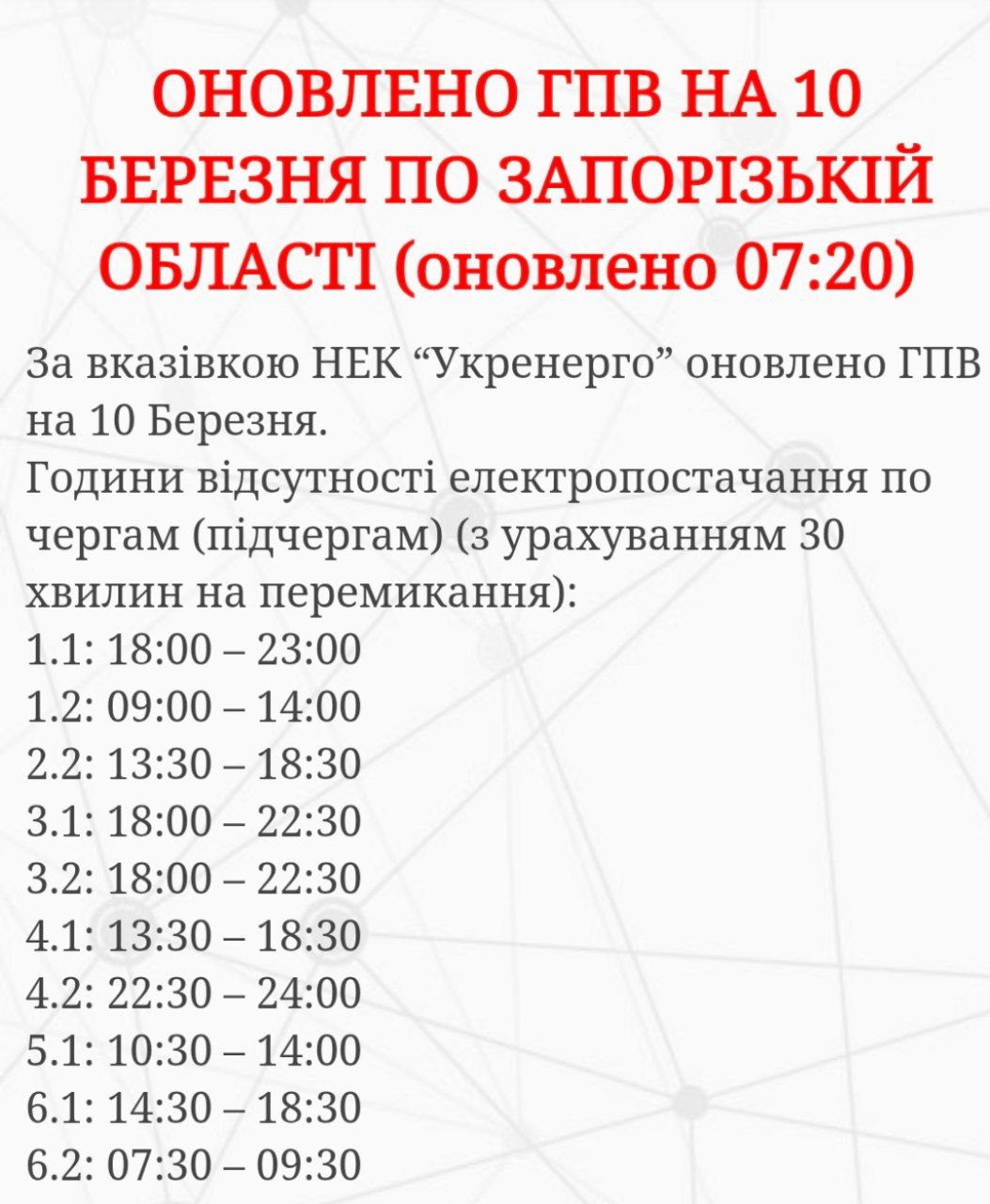 Станом на зараз діє такий оновлений ГПВ у Запоріжжі та області: