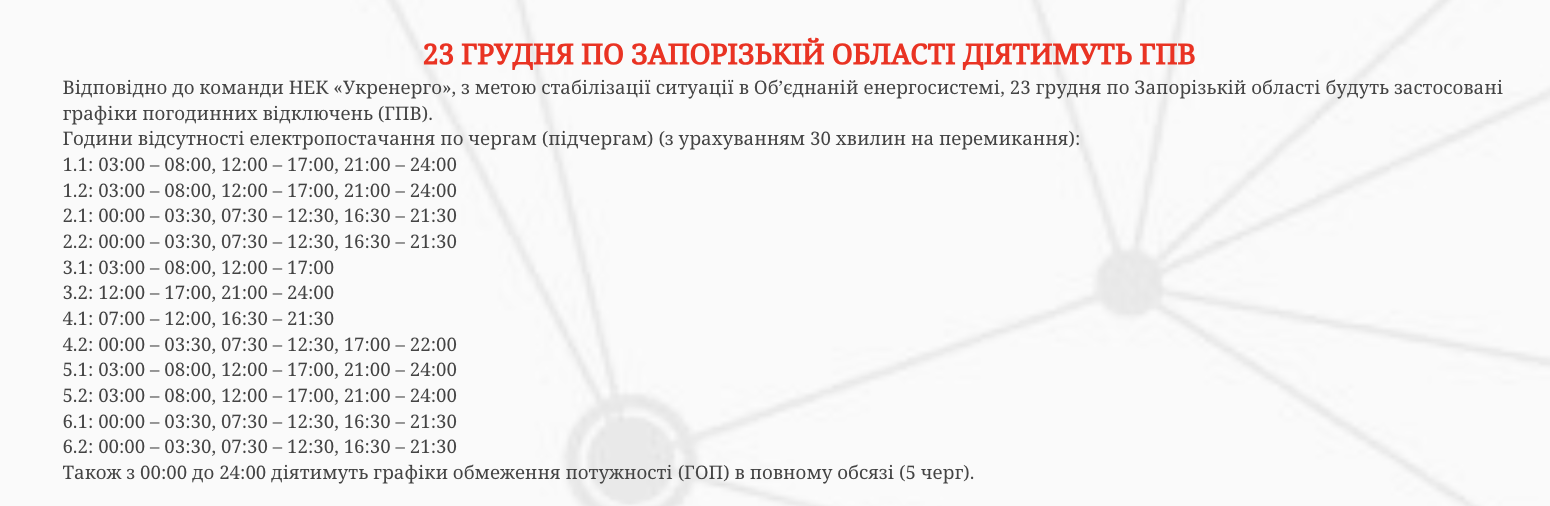 У Запорізькій області 23 грудня для промислових споживачів запроваджено графіки аварійних відключень електроенергії. Рішення ухвалене за вказівкою НЕК «Укренерго» для стабілізації роботи Об’єднаної енергосистеми України.