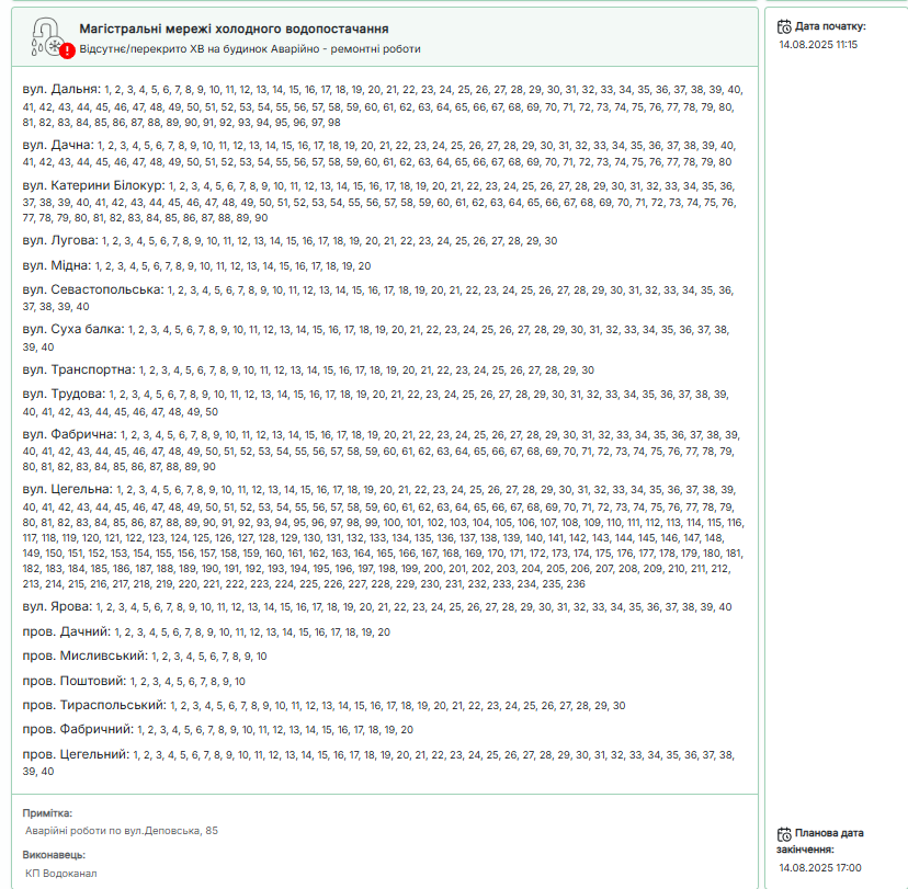 14 серпня 2025 року у зв’язку з аварійними роботами на магістральних мережах холодного водопостачання по вул. Деповська, 85 буде відсутнє водопостачання у мешканців низки вулиць та провулків.