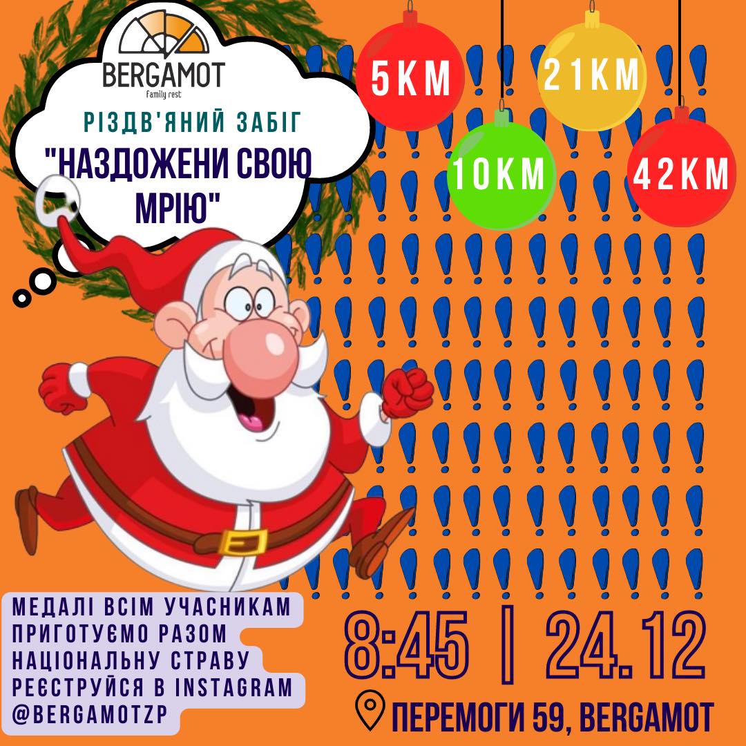 Для реєстрації на Різдвяний забіг “Наздожени свою мрію” потрібно написати одним повідомленням свої прізвище, ім’я та побатькові, повідомити рік народження в дірект на сторінці ресторану «Bergamot» у соцмережі інстаграм за посиланням: