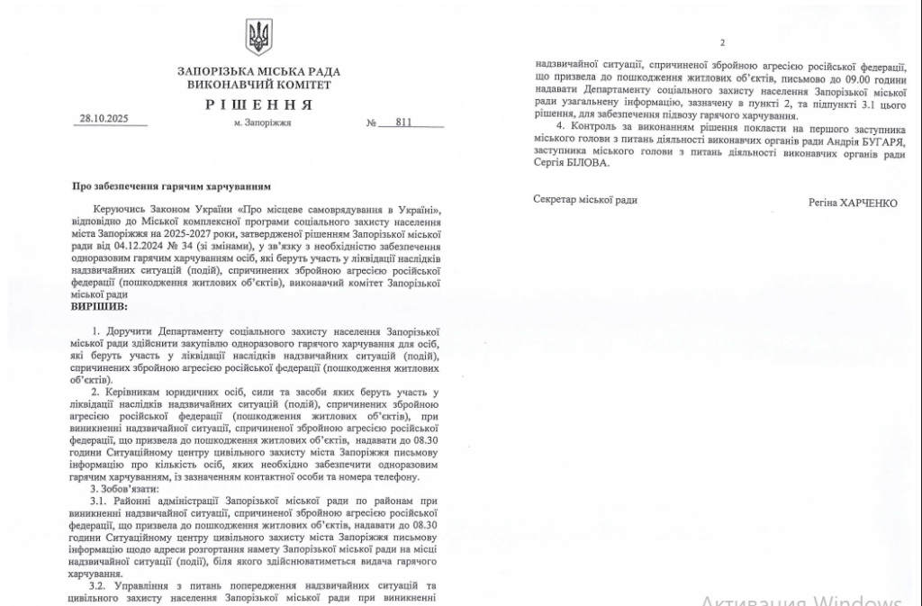 Виконавчий комітет Запорізької міської ради ухвалив рішення №811 від 28 жовтня 2025 року «Про забезпечення гарячим харчуванням».