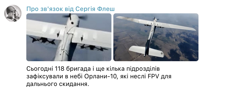 Раніше українські підрозділи помічали такі «Орлани» на Запорізькому напрямку. Зокрема, 118-та окрема механізована бригада та ще кілька частин нещодавно зафіксували подібні апарати з підвішеними під крилами FPV. У деяких випадках такі носії вдавалося збивати ще до моменту скидання, але сам факт використання подібної тактики доводить її активне випробування російською армією.