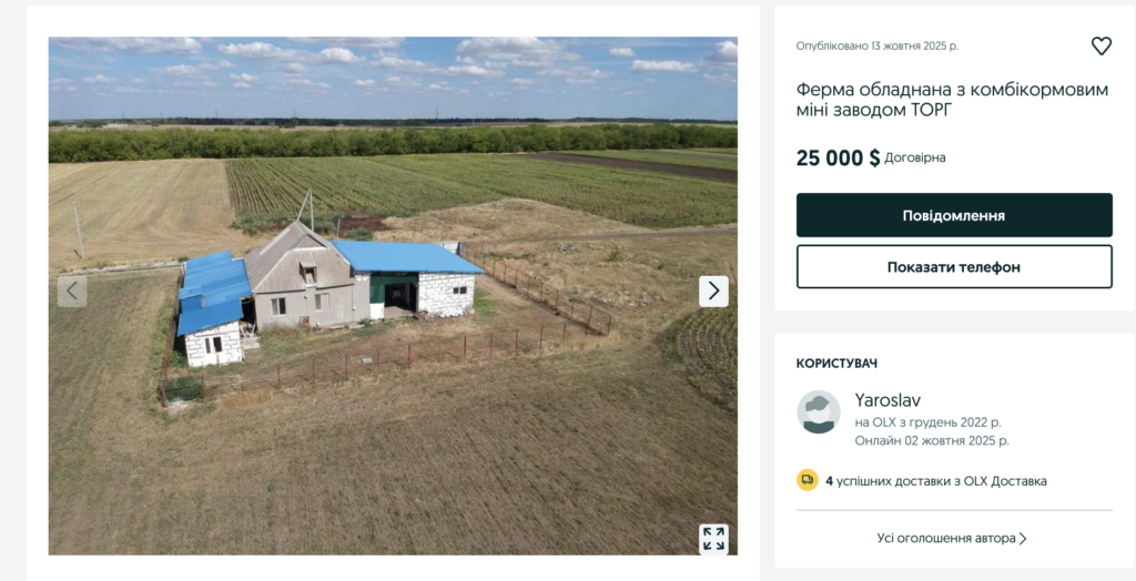 У Запоріжжі оприлюднено оголошення про продаж повністю обладнаної ферми з комбікормовим міні-заводом. Об’єкт розташований у межах міста, загальна площа приміщень — близько 380 м², а вартість продажу становить 25 000 доларів США.