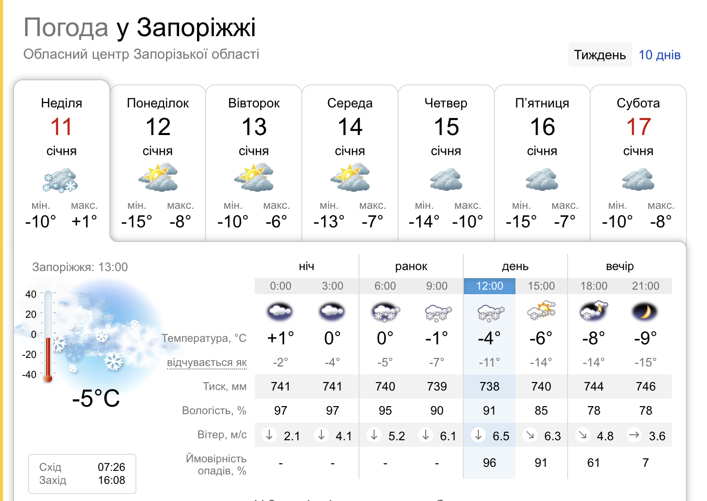 За прогнозами синоптиків, у нічні години температура повітря в Запоріжжі знижуватиметься до –15°, а вдень стовпчики термометрів не підніматимуться вище –6…–8°. Найхолоднішими стануть середина та кінець тижня.