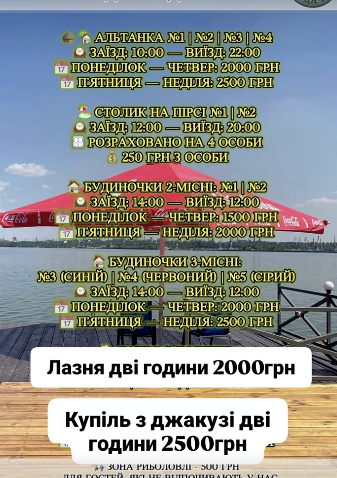 Також у соцмережах публікують фото вечірньої підсвітки, зони біля води, бані, купелі та дерев’яних будиночків. Усе це вказує на те, що акцент зробили на короткому виїзному відпочинку неподалік Дніпра.