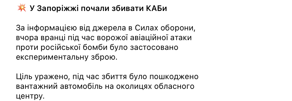 У Запоріжжі з’явилася інформація про перше успішне збиття керованої авіаційної бомби (КАБ), яку російські війська використовують для ударів по місту та області.