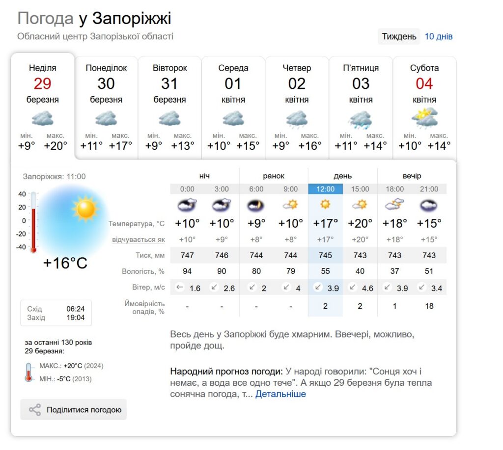 У Запоріжжі найближчими днями очікується переважно хмарна погода з періодичними проясненнями та можливими дощами наприкінці тижня.