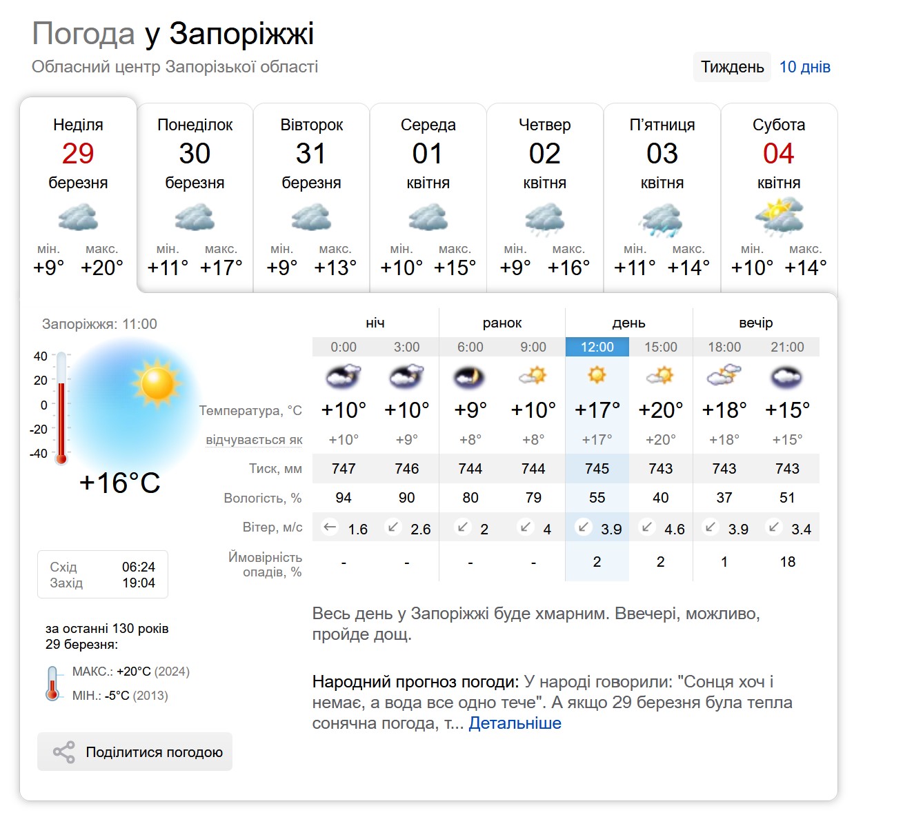 У понеділок, 30 березня, температура повітря вдень підніметься до +17°C, вночі – близько +11°C. Протягом дня буде хмарно, а увечері не виключений дощ.