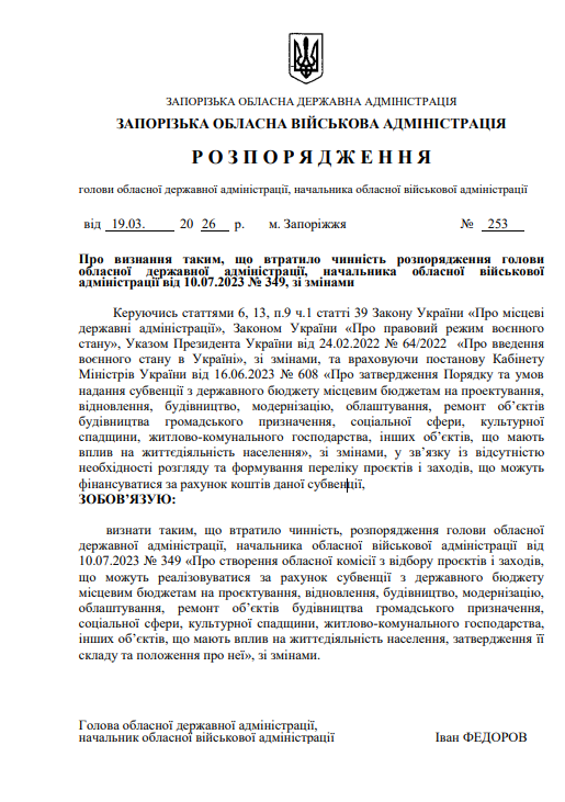 Відповідне рішення 19 березня 2026 року підписав голова обласної державної адміністрації, начальник обласної військової адміністрації Іван Федоров.