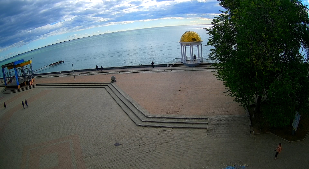 На этот раз в объектив попало одно из знаковых архитектурных сооружений курорта – знаменитая бердянская беседка, расположенная на набережной перед спуском на центральный городской пляж. К слову, часть спусковой лестницы также охватывается трансляцией.