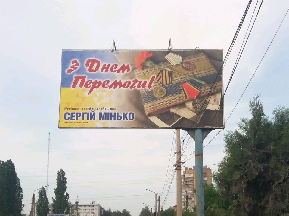Мэр Мелитополя Сергей Минько разместил по городу бигборды с поздравлениями ко Дню победы, на которых находится фото с тремя медалями. Интересно, что одна из них совершенно не относится к памятной дате.