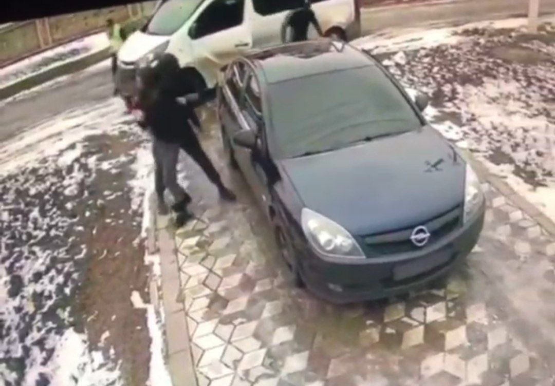 Так, на нем видно, что когда девушка подъехала на авто к воротам частного дома, позади нее остановился белый микроавтобус, из которого выбежали люди в масках и жилетах с надписью “полиция” и с муляжами пистолетов. Ее положили на капот машины.