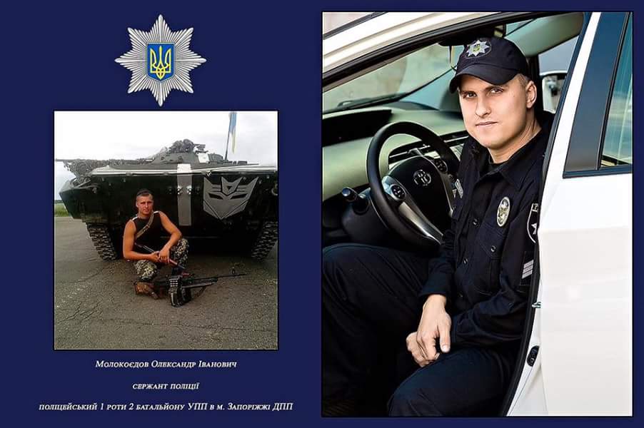 Об одном из таких своих подопечных на своей странице в социальной сети рассказал глава патрульной полиции Запорожья Роман Пилипенко. Сержант Александр Молокоедов до службы в полиции защищал Донецкий аэропорт. За личное мужество и героизм в боях на Донбасее «киборг» в октябре 2014 года был награжден орденом Богдана Хмельницкого III степени.