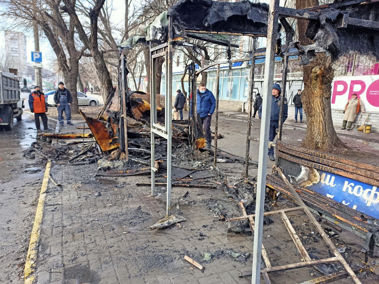 В центре Запорожье на остановке 6-я городская больница на Победе загорелась остановка.
