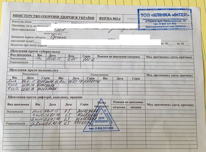 Дмитрий пишет, что в одной из амбулаторий Одессы, 12 февраля, родители 3 летнего ребенка принесли справку о вакцинации от ООО Клиника “Интер”, которая располагается по адресу Прохоровская, 79, которого не существует. В Запорожье эта клиника находится по адресу Рекордная, 43, которого тоже не существует.