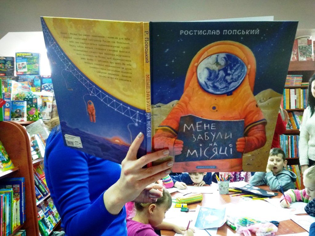 В Запорожье, 23 февраля, в «Книгарні Є» состоялось чтение книги Ростислава Попского «Мене забули на Місяці», для детей возрастом от 4-8 лет и их родителей.