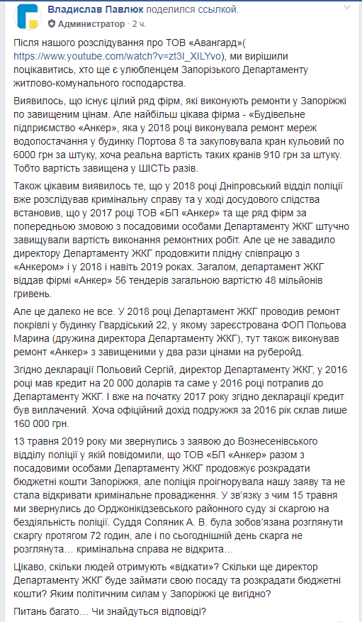 “Цікаво, скільки людей отримують «відкати»? Скільки ще директор Департаменту ЖКГ буде займати свою посаду та розкрадати бюджетні кошти? Яким політичним силам у Запоріжжі це вигідно? Питань багато… Чи знайдуться відповіді?”, – спрашивают журналисты.