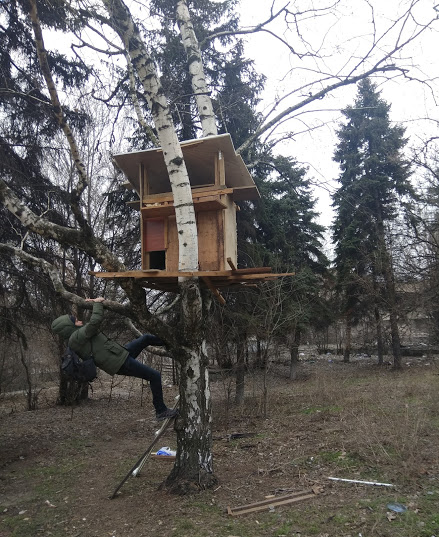 В Запорожье, в Парке трудовой славы, построили домик на дереве для уличных котов.