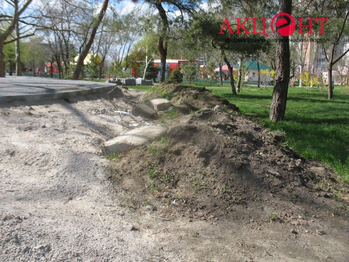 Парк Юбилейный, Хортицкий район. Осенью 2016 года началась реконструкция парка. «НАКОНЕЦ-ТО!» подумалось… В апреле 2017 работы возобновились. Осуществляя 13 апреля общественный контроль в зоне проведения строительства, обратил внимание на то, что на газоне лежит тротуарный камень, тем самым уничтожая растительный слой газона (фото.1). Сделал замечание бригадиру, реакция адекватная: «сейчас уберем».