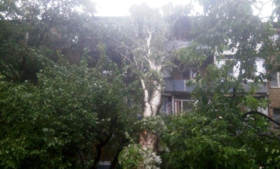 Естественно падение такого дерева вызвало последствия. Так, у жительницы пятого этажа тополь ветками разбил окна балкона. Теперь дождь заливает балкон.