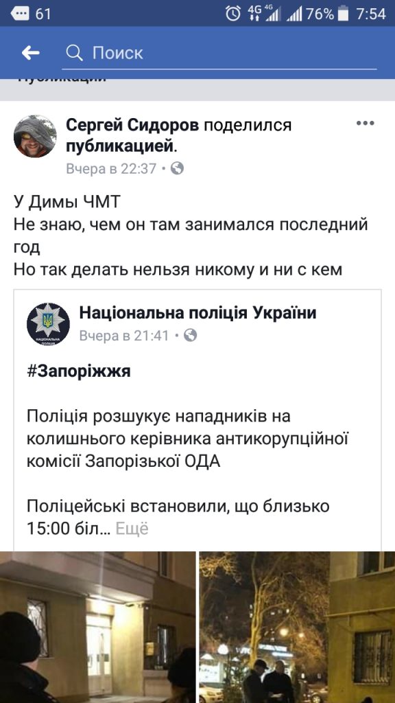 В Запорожье, 5 марта, в 15:00 было совершено нападение на экс-главу антикоррупционной комиссии ЗОГА. Пострадавший находится в реанимации с черепно-мозговой травмой. Вероятно речь идет о Дмитрии Марченко.