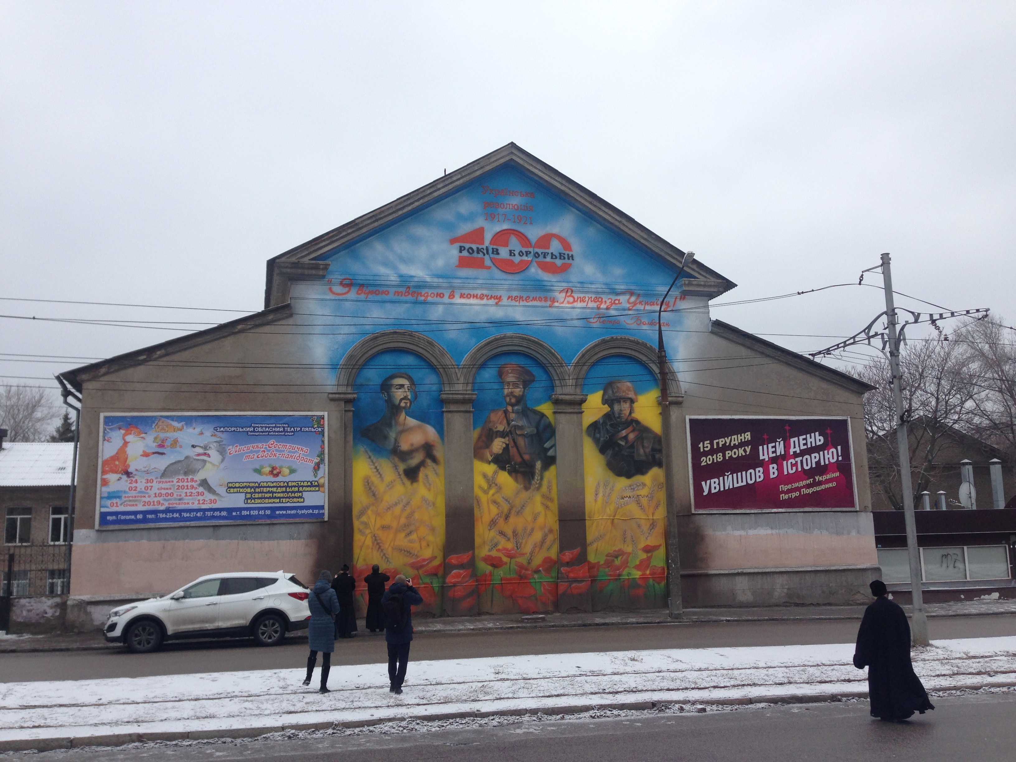 В Запорожье, 30 декабря, на стене здания Запорожского областного театра кукол, напротив ЗНТУ, открыли новый мурал в честь 100-летия борьбы Украины за независимость.