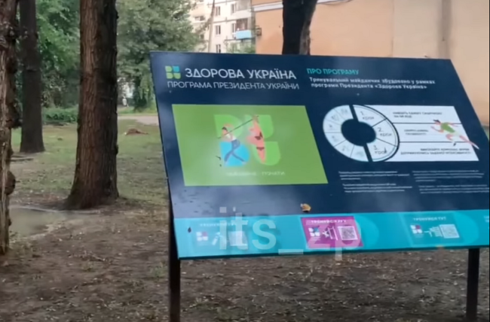 “Заводской район, старая площадка была просто покрашена, рядом установили табличку, как будто она была построена в рамках президентской программы “Здорова Україна”. Этой площадке уже больше пяти лет“, – комментирует ситуацию автор видео.