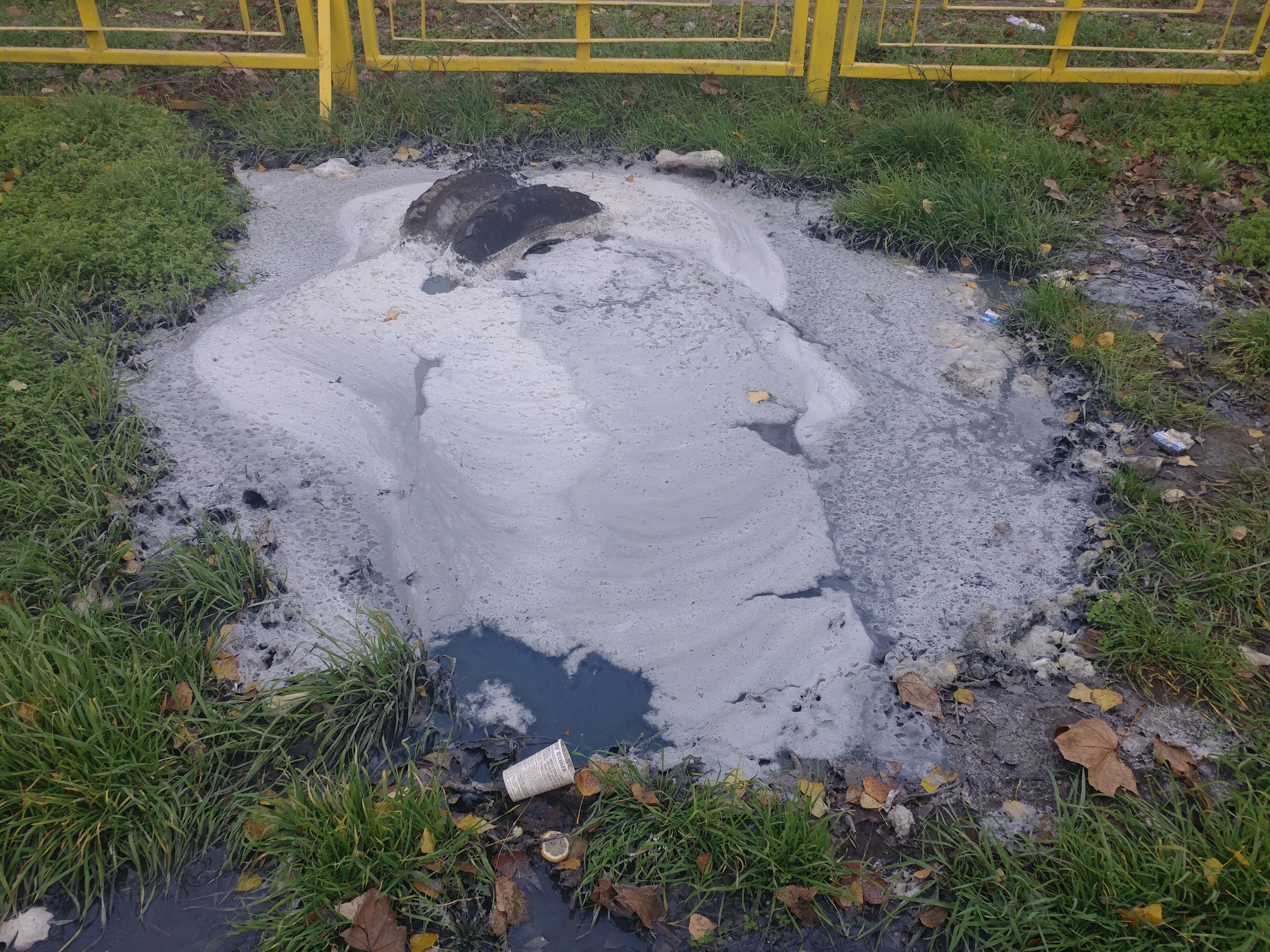 Прошло уже более 10 дней, но к работам на аварийном объекте никто так и не приступил. Более того, аварийный участок даже не ограничен сигнальными лентами и всё это время нечистоты заливали тротуар и проезжую часть. С наступлением холодов стоки на тротуаре и проезжей части превратились в лёд, но в самом коллекторе они не замёрзли.