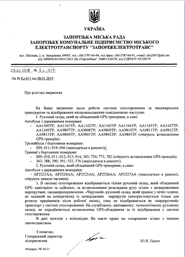 Как видно из документа, по состоянию на 29 января, без GPS все 19 поставленных в декабре автобусов МАЗ. Среди троллейбусов – таких 4 штуки, которые находятся в ремонте. Плохо с GPS-трекерами обстоят дела и у трамваев – без них целых 16 вагонов. Из этого числа 10 ожидают установки, очевидно это недавно полученные б/у трамваи из Европы и реконструированные силами “Запорожэлектротранса”. Еще 6 вагонов находится в ремонте
