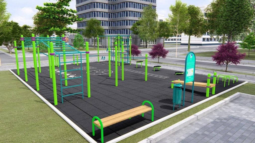 В частности, площадки имеют устелить резиновым покрытием и разметить краской. Также обустроить их комплексами с подвесной системой рукоятей, скамейками для пресса, турниками и брусьями, тумбами для прыжков и рукоходами-лестницами.