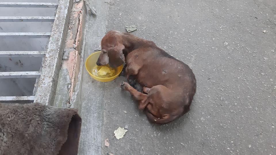 Филя (так зовут пса) оказался очень голодным, набросился на воду и еду.По большей мере лежит пластом, вздрагивает, с трудом поднимает лишь голову.