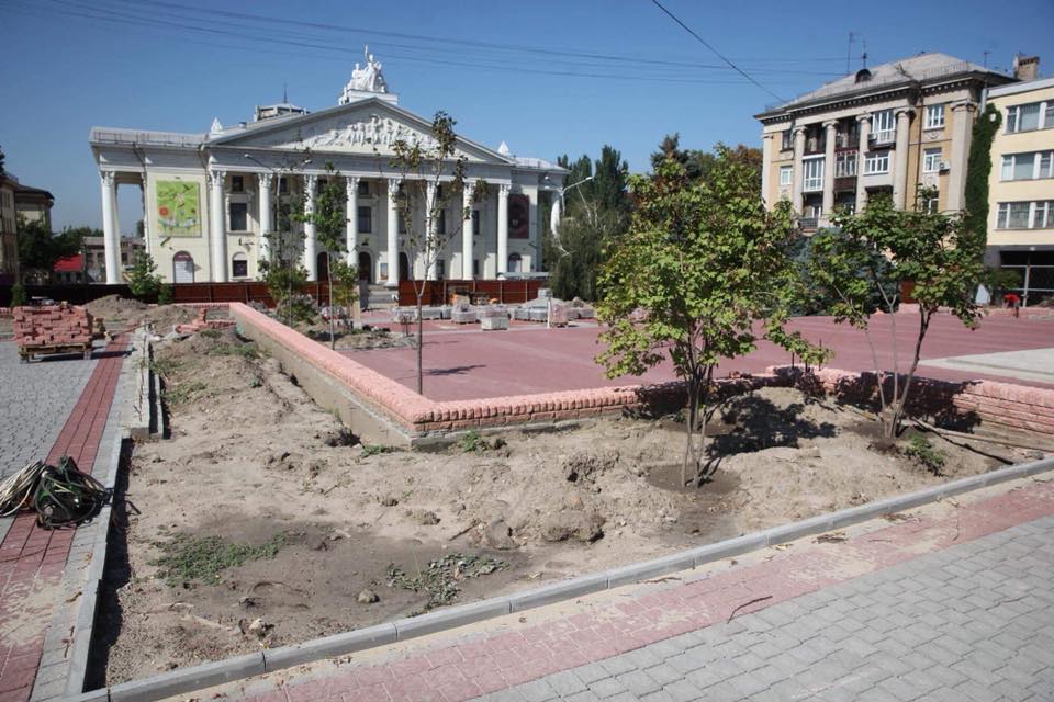 В Запорожье проходит реконструкция сквера Театрального, который располагается напротив театра им. Магара. Ранее сообщалось, что сквер должны доделать ко Дню Независимости, однако Владимир Буряк на своей странице в социальной сети сообщил, что сроки сдвинулись и сквер закончат к середине сентября.
