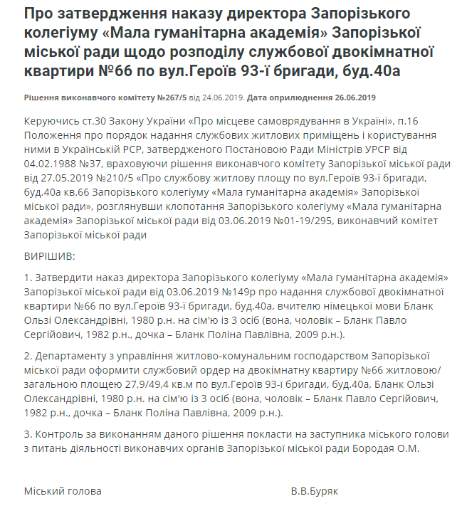 Решение исполкома о выделении служебного жилья Ольге Бланк, которая является женой директора департамента спорта, семьи и молодежи Запорожского горсовета Павла Бланка опубликовано на сайте мэрии.