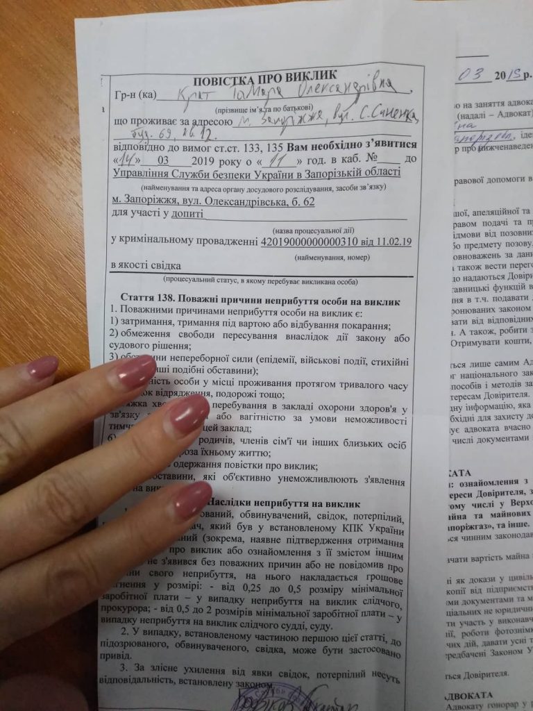Тамара Крат, состоящая в партии “Батькивщина” с 2005 года, рассказала о том, что повестку сотрудники СБУ вручили не ей лично в руки, а ее внучке. Это произошло вечером, примерно в половину восьмого. Внучка подписалась о получении повестки вместо Тамары, чтобы не беспокоить женщину.