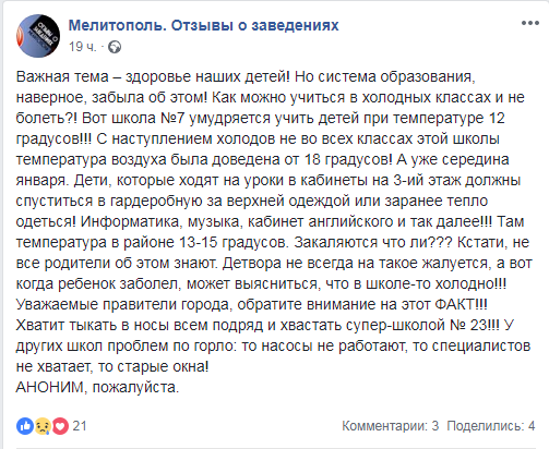 Житель Мелитополя пожаловался в одну из групп в Фейсбуке о том, что его дети учатся в холодных классах. Температура воздуха, по словам мелитопольца, в школе №7 не достигает 18 градусов, а держится на уровне 12.