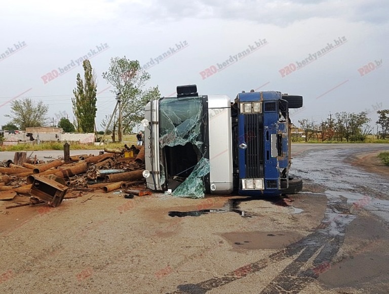 В Запорожской области, недалеко от Бердянска, перевернулась фура. В ДТП пострадал водитель.
