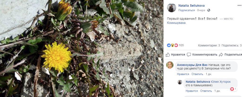 В поселке Камышеваха, что в Ореховском районе, запечатлели первый расцветший в 2019 году одуванчик