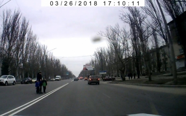 В соцсети появился снимок, на котором видно, как женщина в Мелитополе с двумя детьми переходила дорогу в неположенном для этого месте.