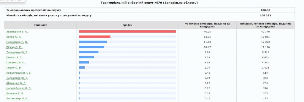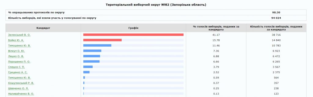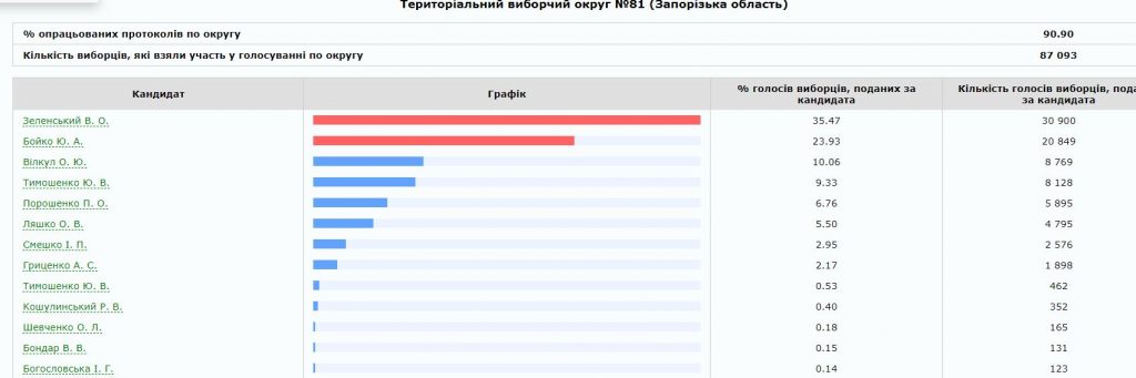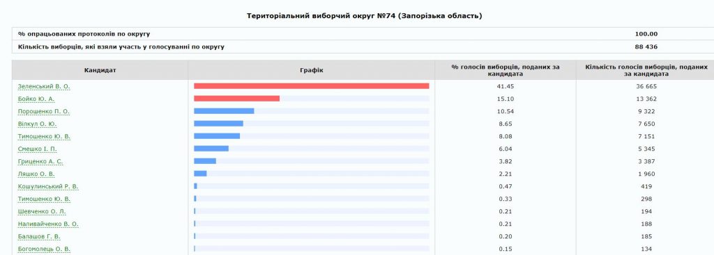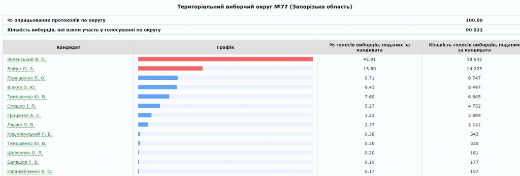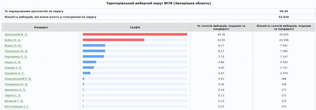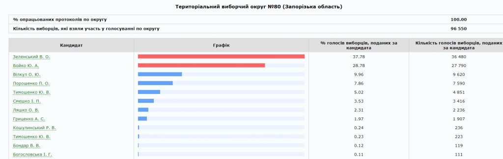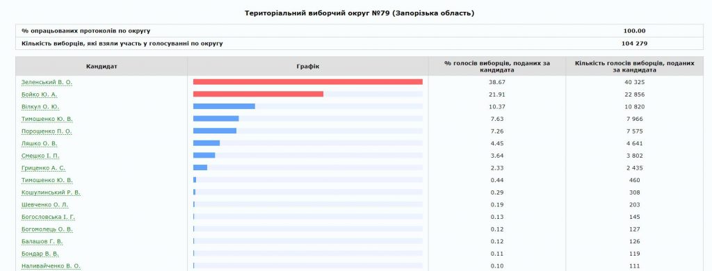 Лучшим для Бойко стал прогнозируемо округ № 80 с центром в Мелитополе, где лидер “Оппозиционной платформы за Жизнь” в последний момент договорился о поддержке с нардепом и местным олигархом Евгением Балицким. Здесь наиболее сильные в регионе условно “пророссийские” настроения и потому логичным выглядит низким результат для Юлии Тимошенко. Провальным можно считать результат и для Порошенко, ведь у него в обойме здесь был мэр Мелитополя от БПП Сергей Минько. Очевидно, что после второго утра, (а может и до?) Минько в очередной раз может перекраситься.