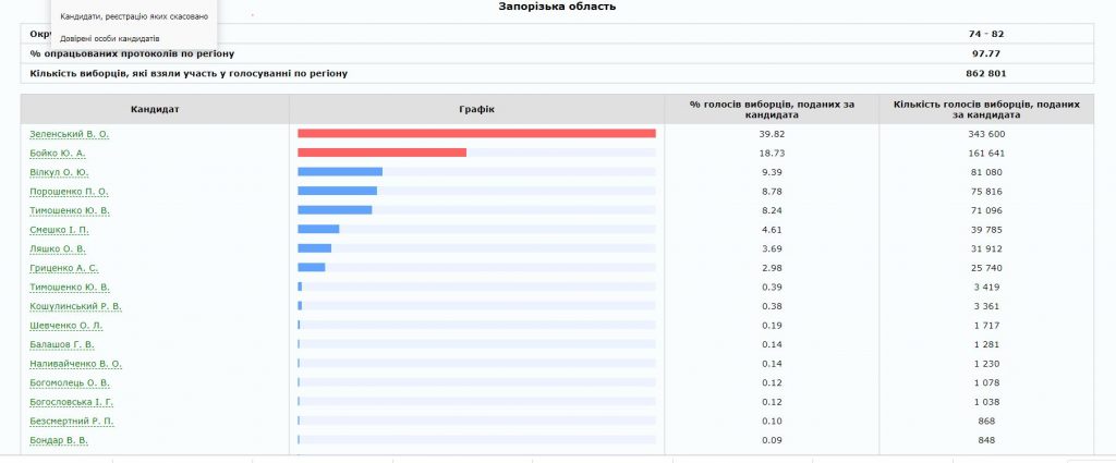 Первое место с результатом почти 40% занимает Владимир Зеленский. Далее расположились Юрий Бойко (почти 19%). Александр Вилкул, Петр Порошенко и Юлия Тимошенко имею почти одинаковый результат в пределах 8-9%.