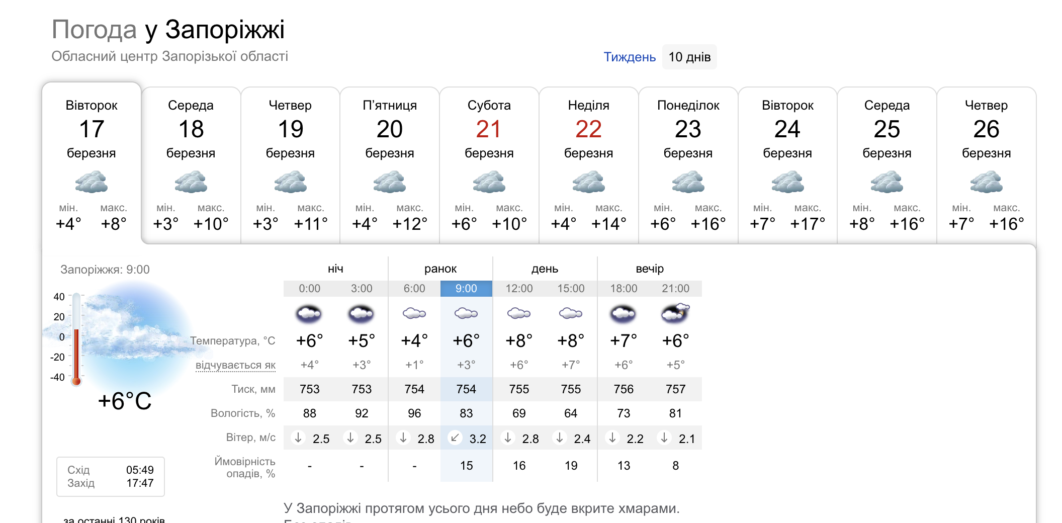 Попри потепління, небо над містом переважно буде хмарним. Тож запоріжцям варто готуватися до по-справжньому весняної, але нестійкої погоди без різкого сонячного прориву.