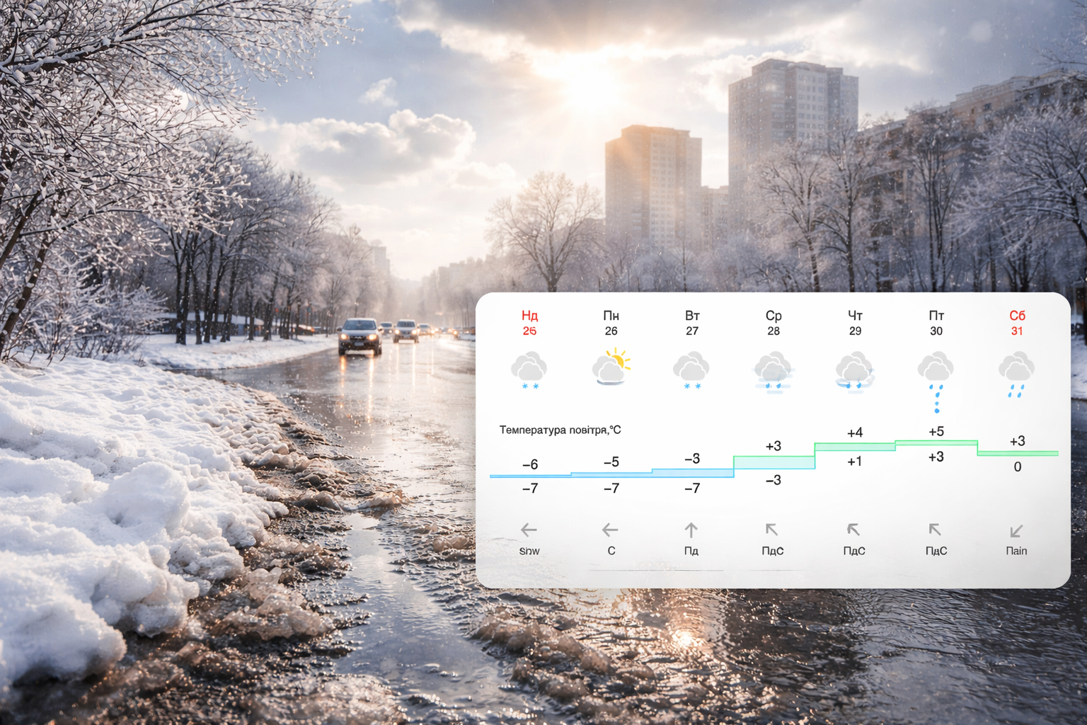 - Середа, 28 січня, стане переломним днем. Денна температура підніметься до +3°, нічна – близько -3°. Очікуються опади у вигляді мокрого снігу та дощу.