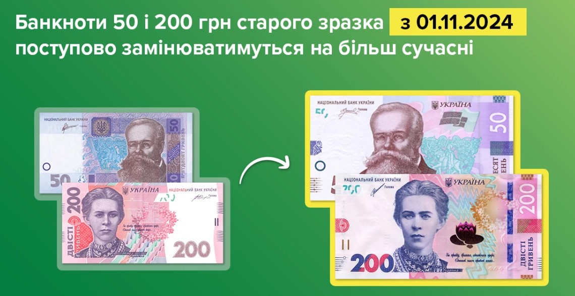 Із 1 листопада Національний банк розпочне поступову заміну банкнот номіналами 50 та 200 гривень зразків 2003 – 2007 років на банкноти аналогічних номіналів сучасного покоління (зразка 2014 року та наступних років випуску).