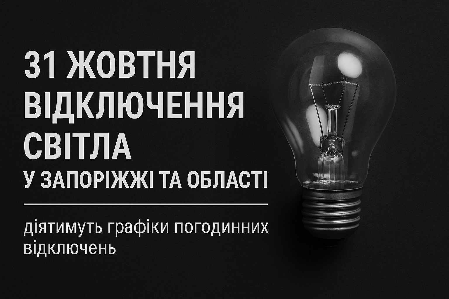 Відповідно до рішення НЕК «Укренерго», 31 жовтня у Запорізькій області буде застосовано графіки погодинних відключень електроенергії (ГПВ). Мета — стабілізувати навантаження на енергосистему та уникнути аварійних збоїв.