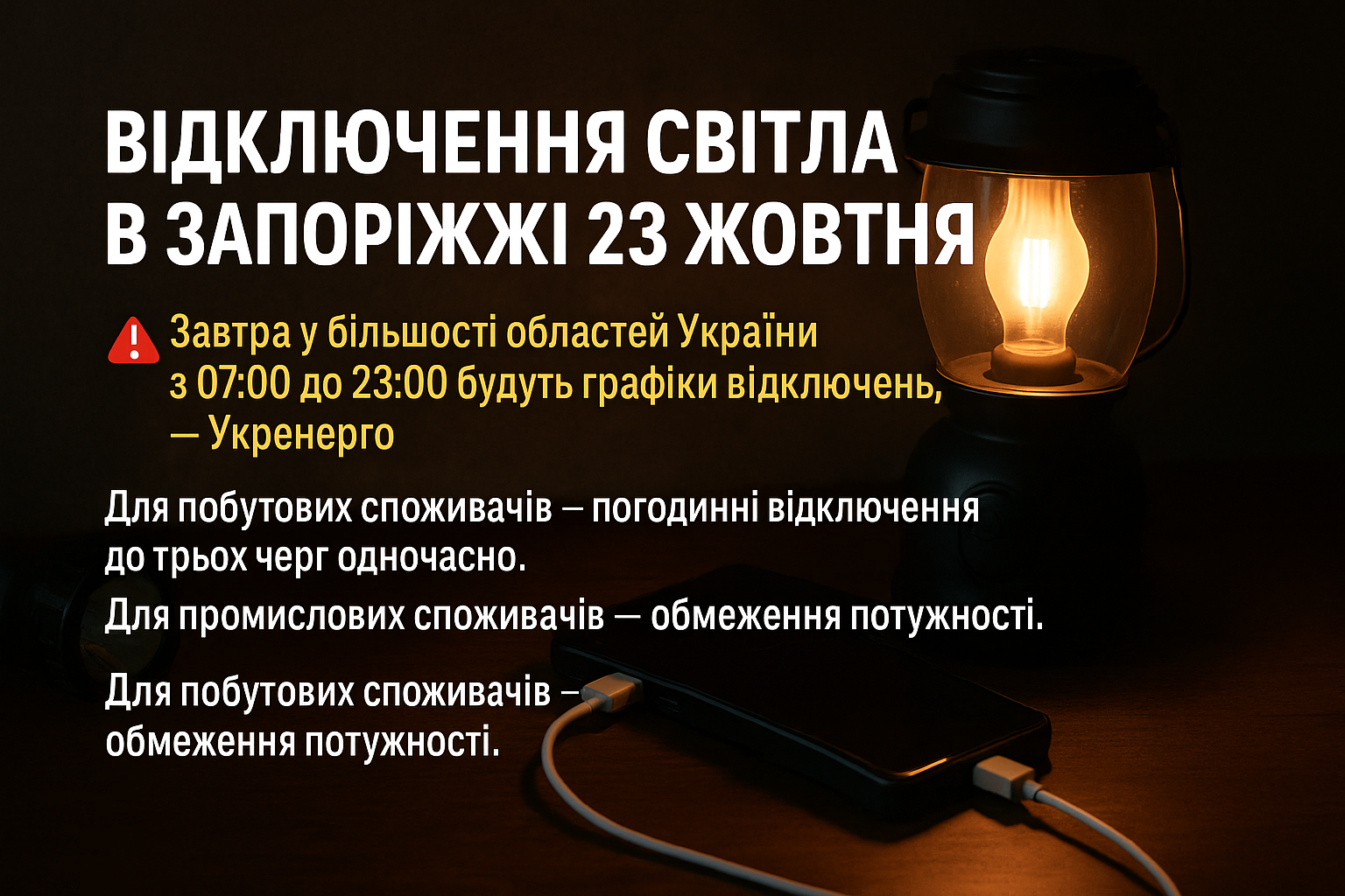 Національна енергетична компанія «Укренерго» повідомила, що 23 жовтня у більшості областей України, зокрема й у Запорізькій, будуть застосовані графіки погодинних відключень.